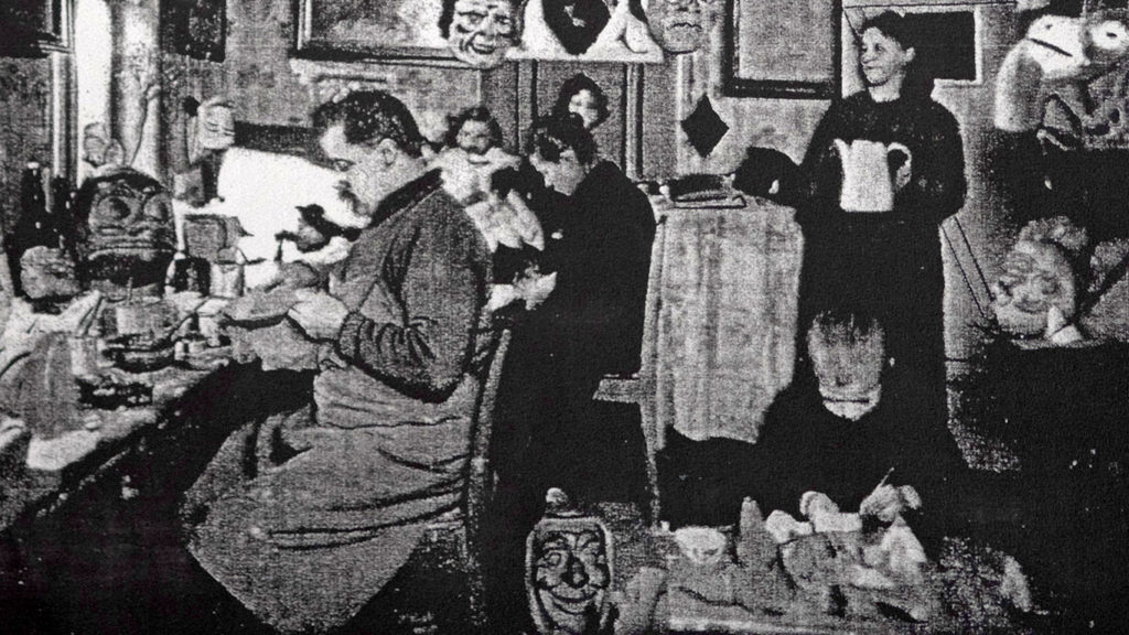 „Das ist Ari Drückerin, von ihr habe ich eben erzählt. Sie wird in hundert Jahren unsere Masken herstellen.“ Zu mir gewandt. „Das hier“, sie zeigt auf den Mann, der die Masken anmalt, „ist mein Mann Robert (1886-1936). Er hilft uns aus kurz vor der Fasnacht. Aber sonst hat er sein eigenes Geschäft. Und das sind unsere Söhne. Der Eine malt bei seinem Vater und der Andere dekoriert. Sie verdienen sich gerne etwas Taschengeld.“ Die Jungen blicken nicht auf. Sie sind es sich gewohnt bei der Arbeit beobachtet zu werden. „Und dort drüben arbeitet noch unsere einzige Mitarbeiterin Priska. Ansonsten habe ich noch einige Heimarbeiterinnen. Schauen sie sich ruhig um. Ich geh in die Küche und mache uns einen Tee.“