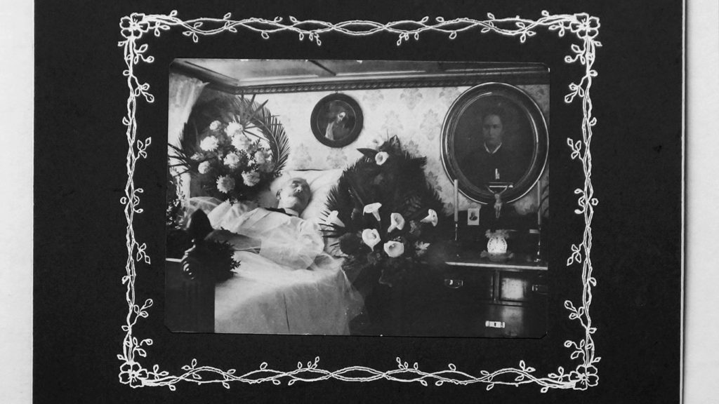 Das Bild erinnert mich an meinen verstorbenen Grossvater. Er ist zu Hause in einem ähnlichen Bett gestorben. Um ihn die ganze Familie vereint. Frau O. unterbricht meine Gedanken. „Ich weiss noch: Als er gestorben ist, bin ich mit meiner Mutter zu seiner Frau gegangen. Wir haben Blumen gebracht. Er war der erste Mensch, den ich tot gesehen habe. Ich war erstaunt. Er sah so friedlich aus.“